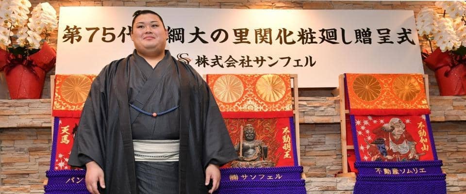 横綱大の里(25)=二所ノ関=が28日、二所ノ関親方(元横綱稀勢の里)とともに都内で行われた化粧まわしの贈呈式に出席した。東京後援会会長で競馬のG1馬・パンジャタワーのオーナーでもある深澤朝房氏(不動産会社サンフェル代表取締役)から土俵入りで用いる三つぞろいの化粧まわしを受け取った。