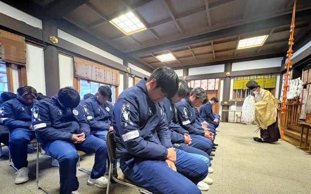 選手らのサインを書いた大きな絵馬などを奉納。神事の後、報道陣の取材に応じた飯田貴敬選手=茨城県桜川市出身=は「『いざ開幕だ』と身が引き締まる思い。J1で結果が残せるかどうか、本当の勝負が始まる。チームを背負って戦い、結果を残したい」と意気込みを語った。