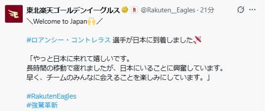 コントレラスは球団を通じ「やっと日本に来られてうれしいです。長時間の移動で疲れましたが、日本にいることに興奮しています。早くチームのみんなに会えることを楽しみにしています」とコメントした。