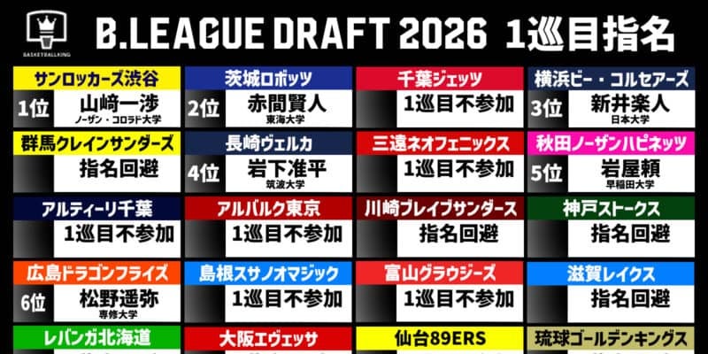 続く全体2位では、茨城ロボッツが赤間賢人(東海大学)を指名。指名回避するクラブもある中、横浜ビー・コルセアーズが同3位で新井楽人(日本大学)、長崎ヴェルカが同4位で岩下准平(筑波大学)、秋田ノーザンハピネッツが岩屋頼(早稲田大学)、広島ドラゴンフライズが同6位で松野遥弥(専修大学)と続いた。