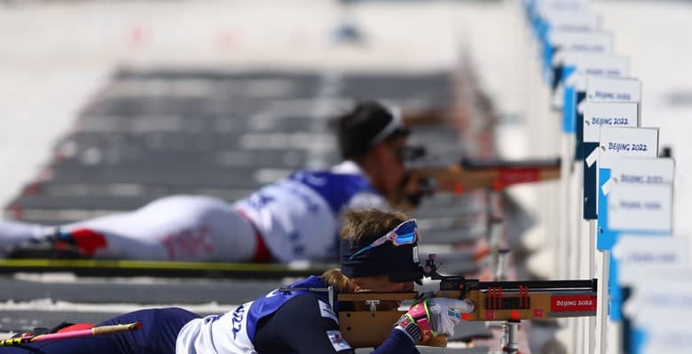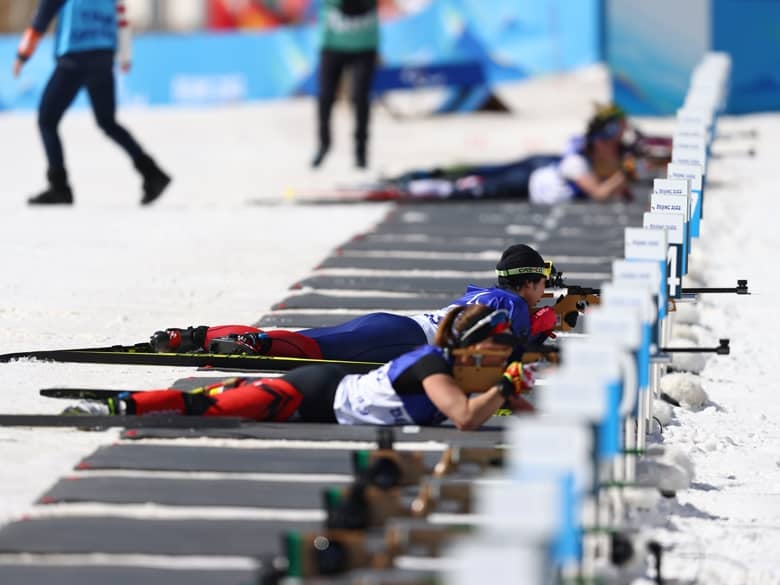 バイアスロンでは、選手がライフルを背負いながらフリースタイルで滑り、周回ごとに射撃を行う。立射と伏射の2種類の姿勢で撃つ。標的は50m先に設置され、伏射では直径45mm、立射では直径115mmの標的を狙う。