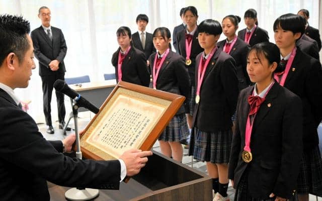 後藤竜也市長は「県サッカー界の記録を塗り替えた快挙に、市民を代表して心からお祝いと感謝を申し上げます」。自宅は学校の近くで、「朝晩、休日にもよく皆さんを見かける。泥まみれになりながらボールを追いかけ、汗と涙を流した日々があったからこそ今回の結果になったと思う」とねぎらった。