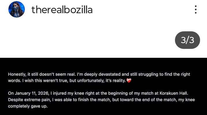 ボジラは「現時点ではどれくらいの期間、欠場することになるのか、いつ復帰できるのかはまだ分かりません。ただ、これだけは分かっています。プロレスは私の人生であり、情熱そのもの。だから、リングを離れなければならないこの状況は、本当に心が痛みます」とした上で「すべてのことには意味があると信じて、前向きでいようと思います。私はこれまで以上に強く、優れた、危険な選手になって必ず戻ってきます」と復帰を誓った。