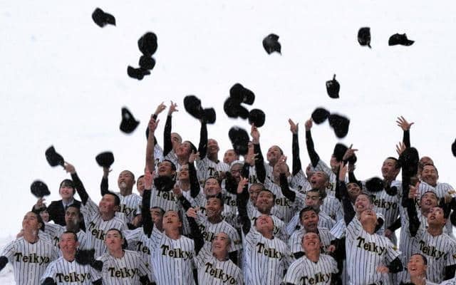 雪が積もった校庭で帽子を投げて喜ぶ帝京長岡の選手たち=新潟県長岡市、山口裕起撮影