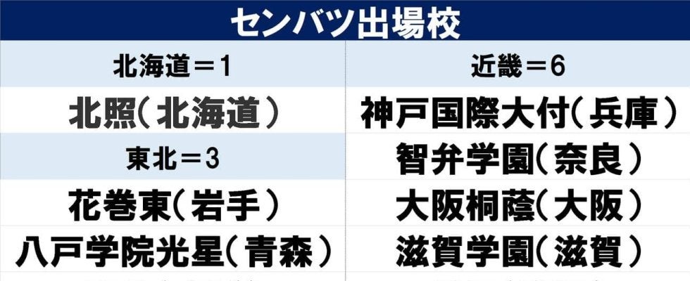 第98回選抜野球大会(26年3月19日開幕、甲子園)の選考委員会が30日、大阪市内で行われ、出場32校が決定した。全国9地区の候補校から推薦された21世紀枠は高知農、長崎西の2校が選ばれた。東北地区の3校目は東北(宮城)、関東・東京地区の6校目は昨秋関東大会8強の横浜(神奈川)、東海地区の3枠目は大垣日大(岐阜)、神宮大会枠があった九州地区は、4強校に加え、沖縄尚学(那覇)が選出された。