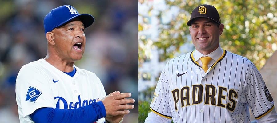 ドジャースのデーブ・ロバーツ監督(左)とパドレスのクレイグ・スタメン監督【写真:イワモトアキト、アフロ】
