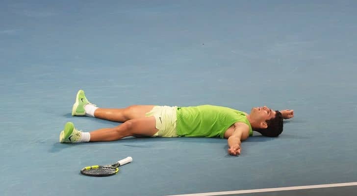 治療後も痛みは増し、一時はセットカウント2-2、最終セットも3-5と崖っぷちまで追い込まれた。しかし、22歳の王者はそこから驚異的な逆転劇を見せた。勝利の瞬間は、力強いガッツポーズでもなく、咆哮を上げるわけでもない。普段喜びを露わにするアルカラスが静かにコートに跪いて大の字で横たわり、勝利を噛み締めた。