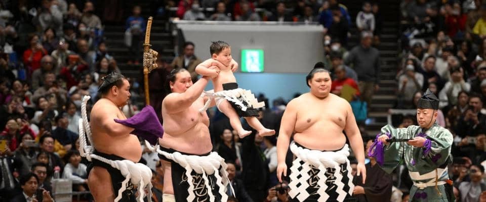 照ノ富士は3歳になった長男で、化粧まわしを締めた照務甚(てむじん)くんを抱いて花道を進んだ。照務甚くんを大の里に預け、堂々の不知火型を披露した。