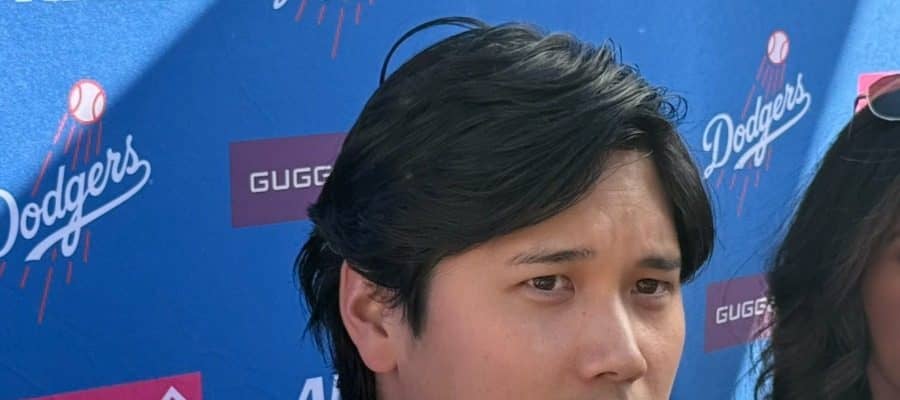 ドジャーフェストに参加し囲み取材を受けたドジャース・大谷翔平【写真:上野明洸】