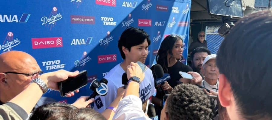 2026年最初の取材対応…報道陣が密集 もはやお馴染みの光景となった。ドジャースのファン感謝イベント「ドジャーフェスト」…