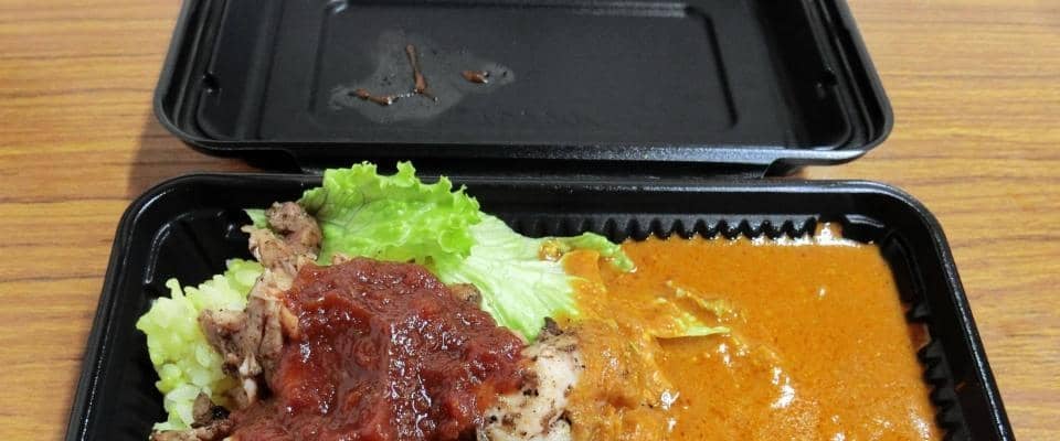初日のメニューは、沖縄市に店舗を構えるバーベキュー料理をメインとした「パナマ原人」の「バターチキンカレー」。大ぶりのチキンが入ったスパイシーな逸品が、列を作った報道陣に次々と手渡された。