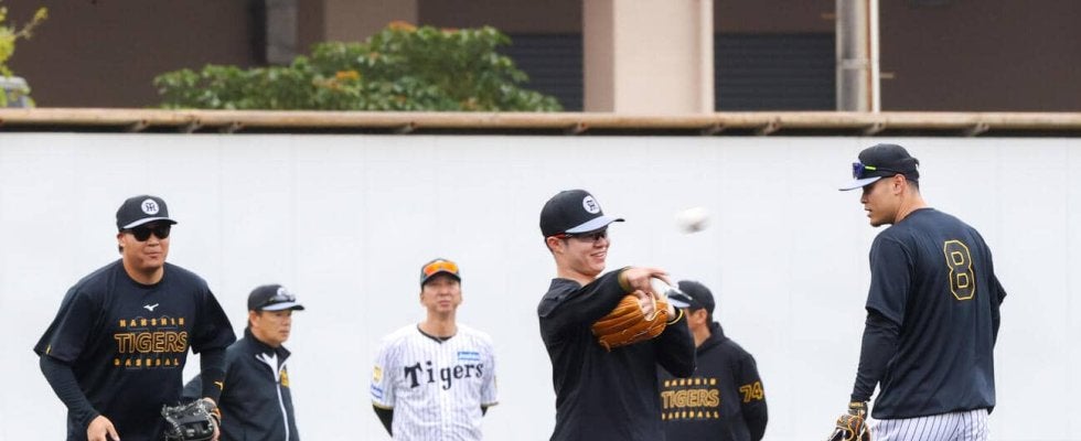 沖縄・宜野座キャンプ2日目。藤川球児監督(45)も見守る中、サブグラウンドで田中秀太内野守備走塁コーチ(48)のノックで汗を流した。佐藤が三塁で62球、大山は一塁と三塁で計59球を受け、中野も二塁で59球をさばいた。