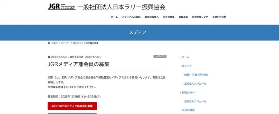 モータースポーツとしてのラリーを社会に普及し、健全な発展と振興を図ることを目的とする一般社団法人日本ラリー振興協会(JGR)は、取材経験豊富なメディアを対象に2026年のメディア部会員を6人募集する。募集は立候補制で、募集期間は2月9日(月)まで。