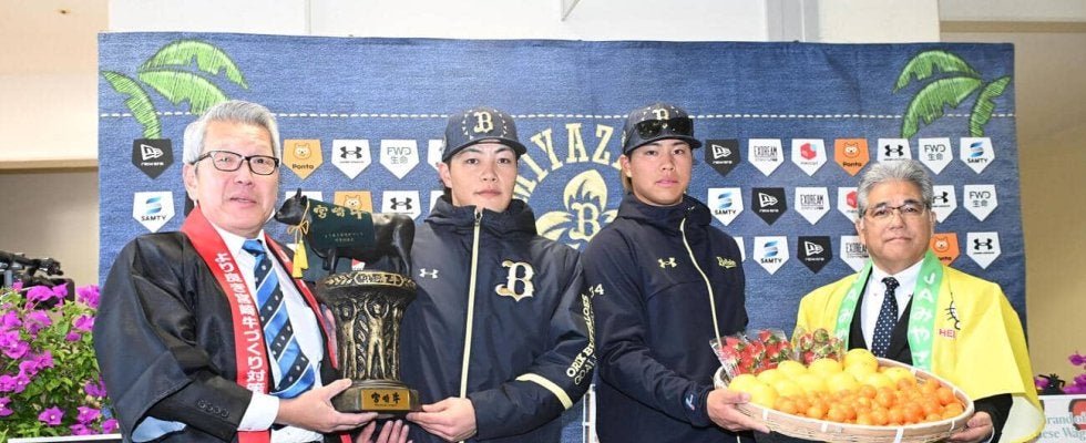 宮崎でキャンプを張るオリックスにJA宮崎から宮崎牛50キロ、きんかん「たまたま」など地元産フルーツ各10ケースが贈呈され…