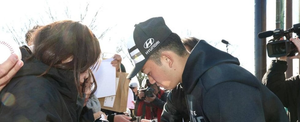 ロッテは春季キャンプ第1クール最終日の3日、サイン会を行った。全体の打撃練習の後、選手たちが2組に分かれて集まったファン…