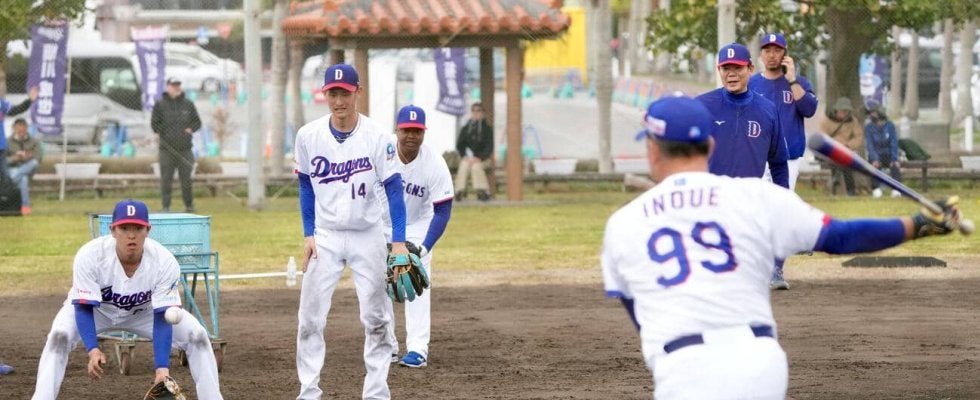 中日井上一樹監督が自らノックを打つ「アゲアゲタイム」で若手右腕を鍛えた。2軍から練習参加している仲地礼亜投手、草加勝投手…
