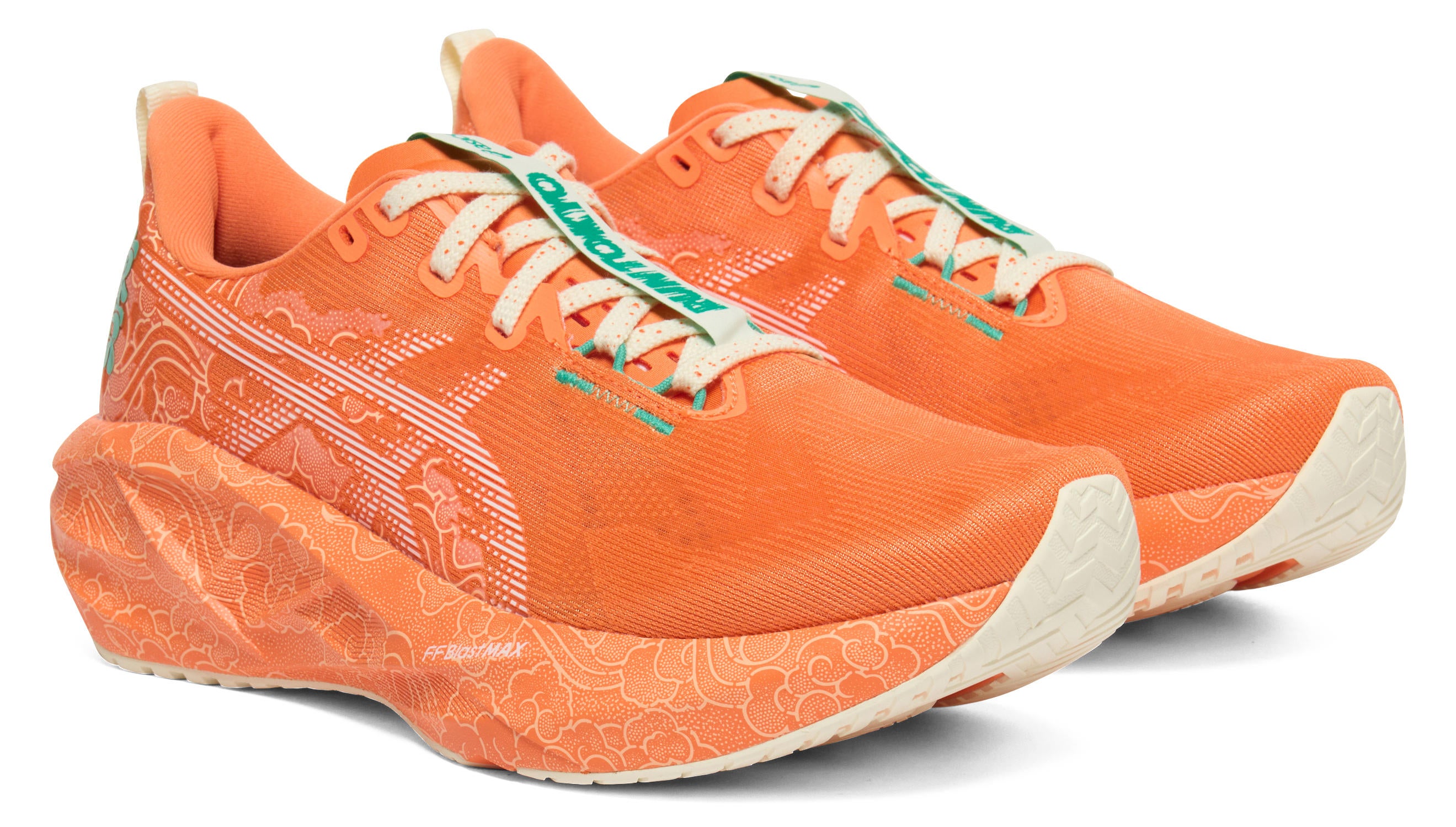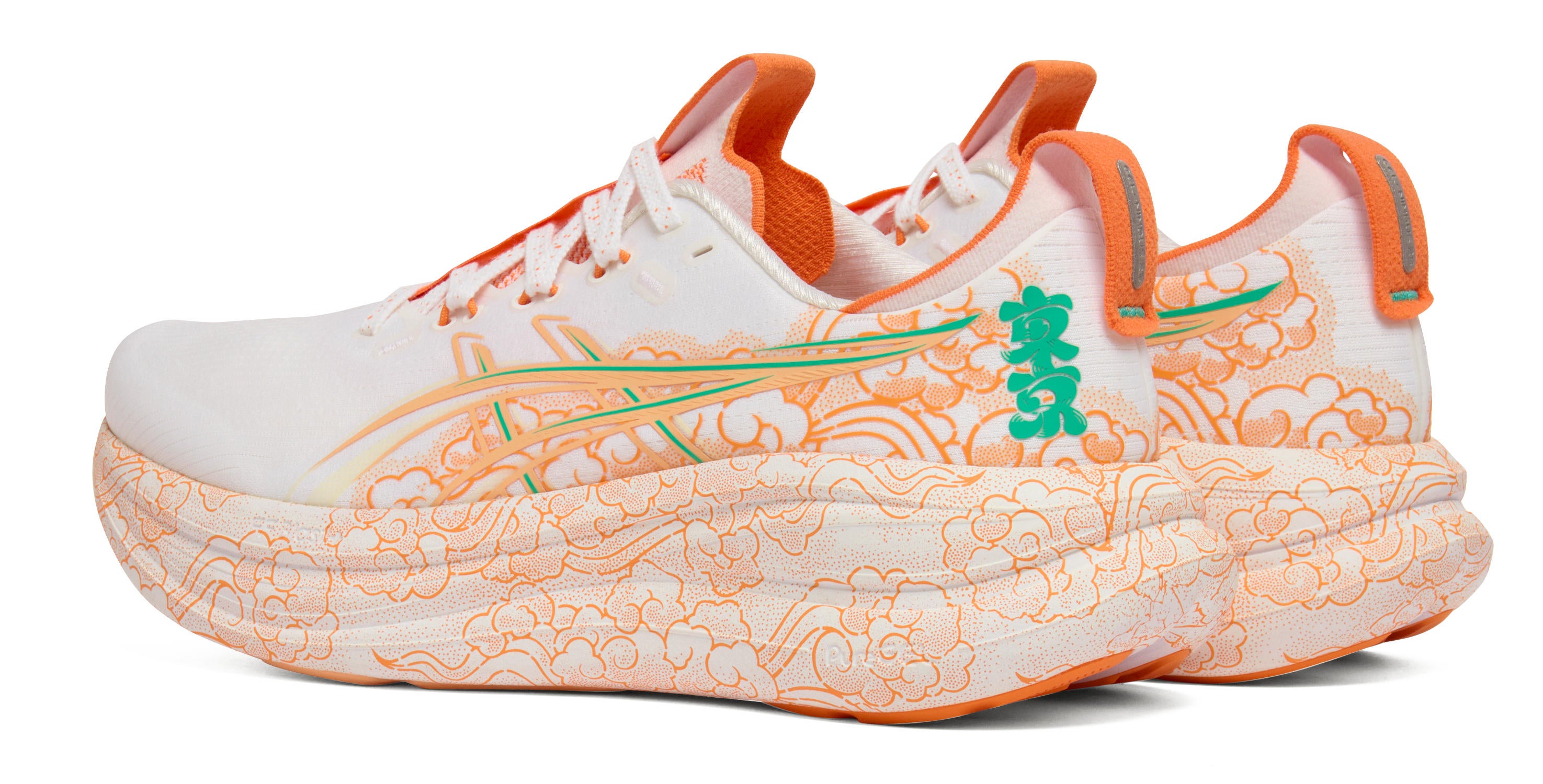今回発売する商品は、「アシックス」ブランドを代表するシューズをベースに、「東京マラソン2026」のテーマカラーであるオレンジをアクセントに取り入れている。アッパー(甲被)やミッドソール(アッパーと靴底の間にある中間クッション材)には、日本語の「息吹」という言葉に着想を得たグラフィックを、日本の伝統工芸である「型紙」からインスピレーションを受けて大胆に表現している。また、かかと部と中敷きには「東京」の文字を施している。