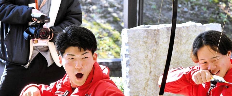 広島の1軍キャンプに参加している新人5選手が4日、キャンプに入って初めての休日で日南市を観光した。ドラフト5位・赤木晴哉投手(22)=仏教大=は四間半(約8・2メートル)先にある小さな的を弓矢で射抜く「四半的(しはんまと)」に挑戦し、正確性を発揮。書道体験では色紙に「初勝利」と記し、先発ローテ入りを射止めて、プロ初勝利へ突き進む決意を示した。