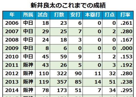 引退後は2軍の育成コーチへと就任する新井良太。1軍での通算成績は、630試合1253打数298安打40本塁打151打点、打率.238。兄よりも素質で勝ると言われながら、成績は兄にはるかに及ばなかった。何と言っても伸び盛りの20代に、中日で控え選手に甘んじたことがキャリアに響いた。初めて100試合に出たのは29歳。遅咲きだったことは否めない。苦労人だっただけに、指導者としての成功を祈りたい。(広尾晃 / Koh Hiroo)