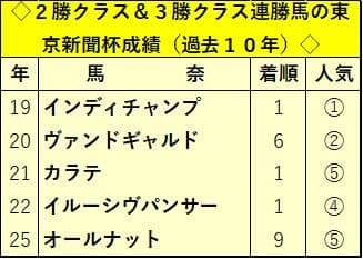 ただ、年齢別で最多5勝を挙げる4歳勢にも注意が必要だ。重賞ウィナーでも2歳重賞(札幌2歳S)のため、G12着馬でも重賞実績による加重がなく、他馬との比較で斤量面で利があるマジックサンズはもちろんだが、重賞初挑戦のエンペラーズソードも勝機十分のデータがある。3勝クラスを勝って臨んだ組は【3・1・0・8】だが、3勝すべては2勝クラス、3勝クラスと連勝していた馬(該当馬5頭、表参照)だった。逃げか番手が見込める組み合わせからも頭の期待ができる。
