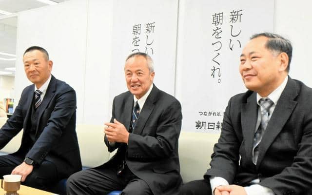 3月19日に開幕する第98回選抜高校野球大会(日本高校野球連盟、毎日新聞社主催、朝日新聞社後援)に出場する東洋大姫路の上田肇校長、岡田龍生監督、平野真吾部長の3人が5日、神戸市中央区の朝日新聞神戸総局を訪れた。