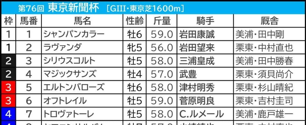 JRAは6日、第76回東京新聞杯(GIII、東京芝1600m)の枠順を発表した。