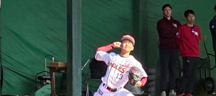 5日に入ったブルペンでは、前回は投げていなかったチェンジアップも初披露しながら、投球後半では実戦が始まればトレードマークとなりそうな、投げ終わりに帽子を飛ばすパフォーマンスで集まったカメラマンらの注目を集めていた。