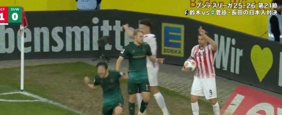 迎えた90+4分、ブレーメンの自陣右サイドからフライブルクのスローインでリスタートする。ボールを受けて時間を稼ごうとしたMFデリー・シェアハントに対して、菅原が果敢にボールを奪いに行き、ゴールライン上での攻防が繰り広げられる。その流れで菅原は相手のボールが出たとして、手を上げてアピールするもプレーはそのまま続行。最後はFWマルコ・グリュルと挟み込む形で対応してボールが外に出たものの、判定はフライブルクのコーナーキックとなった。