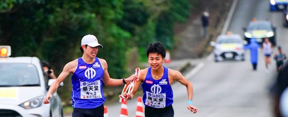 2区で順大の松尾和真(2年)が残り約3キロで東洋大の迎暖人(むかえ・はると、2年)に追いつき、デッドヒートに。中継所手前で順大が首位を奪い、秒差なしの2位に東洋大が続いた。21秒差の3位に青学大、28秒差の国学院大が続いた。