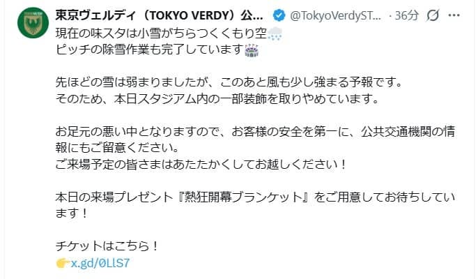 ピッチの写真を添えた上で「現在の味スタは小雪がちらつくくもり空 ピッチの除雪作業も完了しています 先ほどの雪は弱まりましたが、このあと風も少し強まる予報です。そのため、本日スタジアム内の一部装飾を取りやめています。お足元の悪い中となりますので、お客様の安全を第一に、公共交通機関の情報にもご留意ください。ご来場予定の皆さまはあたたかくしてお越しください! 本日の来場プレゼント『熱狂開幕ブランケット』をご用意してお待ちしています!」と投稿した。