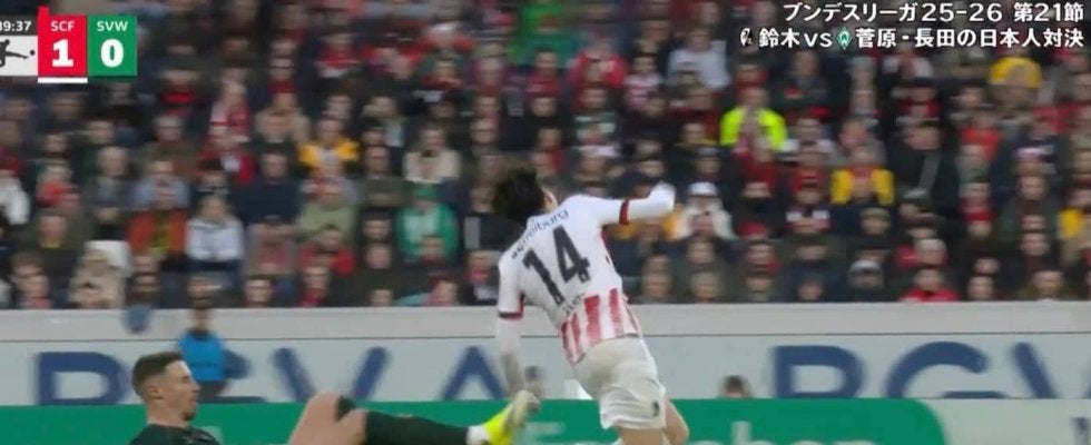 フライブルクに所属する日本代表MFの鈴木唯人が、驚異的な加速力を見せた。相手の危険タックルを受けて止められると、ファンたちが怒りの声をあげている。