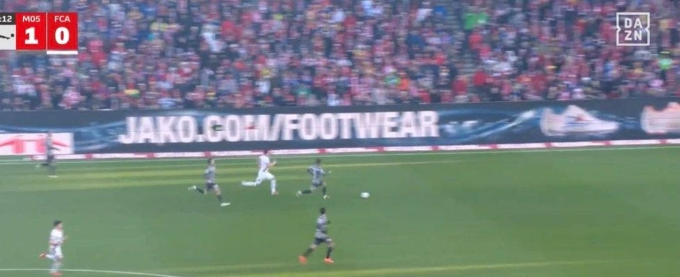 アウクスブルクのDF陣のクリアをFWミヒャエル・グレゴリッチュがハーフウェイライン手前で回収すると、前に突っ込んできたマインツDFシュテファン・ベルの逆を突く形で前方のスペースに大きくボールを持ち出した。