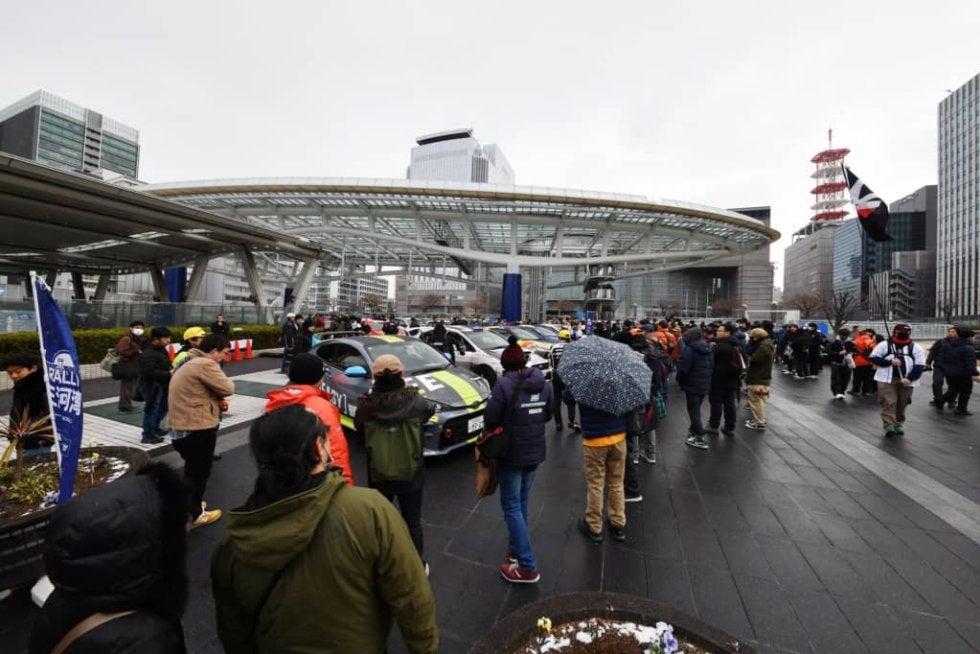 会場となった名古屋の中心地・栄にある「オアシス21 緑の大地(名古屋市東区)」には、午前9時すぎから10台のラリーカーとスイーパー1台が集まり、まずは車両を並べて展示するラリーファンミーティングがスタート。この日はあいにくの雪まじりの天候となったものの、朝早くから多くのファンが来場し、選手と交流できる時間が設けられた。