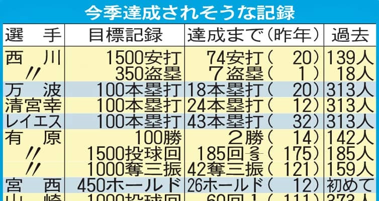 今季の日本ハムではレイエス以外にも万波、清宮幸も100本塁打が近づいている。同一球団の3人以上が同じ年に通算100号を達成すれば、19年西武(秋山、山川、栗山)以来6度目。球団では柏原、加藤俊、富田が達成した80年以来46年ぶりだ。