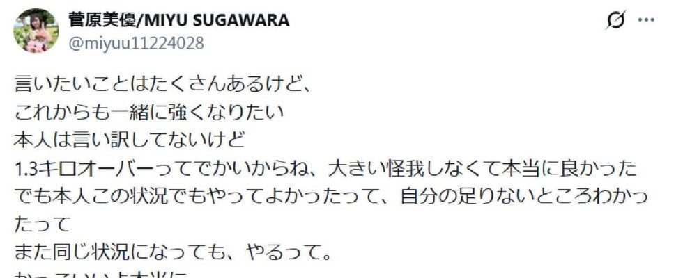 菅原は「言いたいことはたくさんあるけど、これからも一緒に強くなりたい 本人は言い訳してないけど1.3キロオーバーってでかいからね、大きい怪我しなくて本当に良かった でも本人この状況でもやってよかったって、自分の足りないところわかったって また同じ状況になっても、やるって。かっこいいよ本当に」と記して、金子をたたえた。