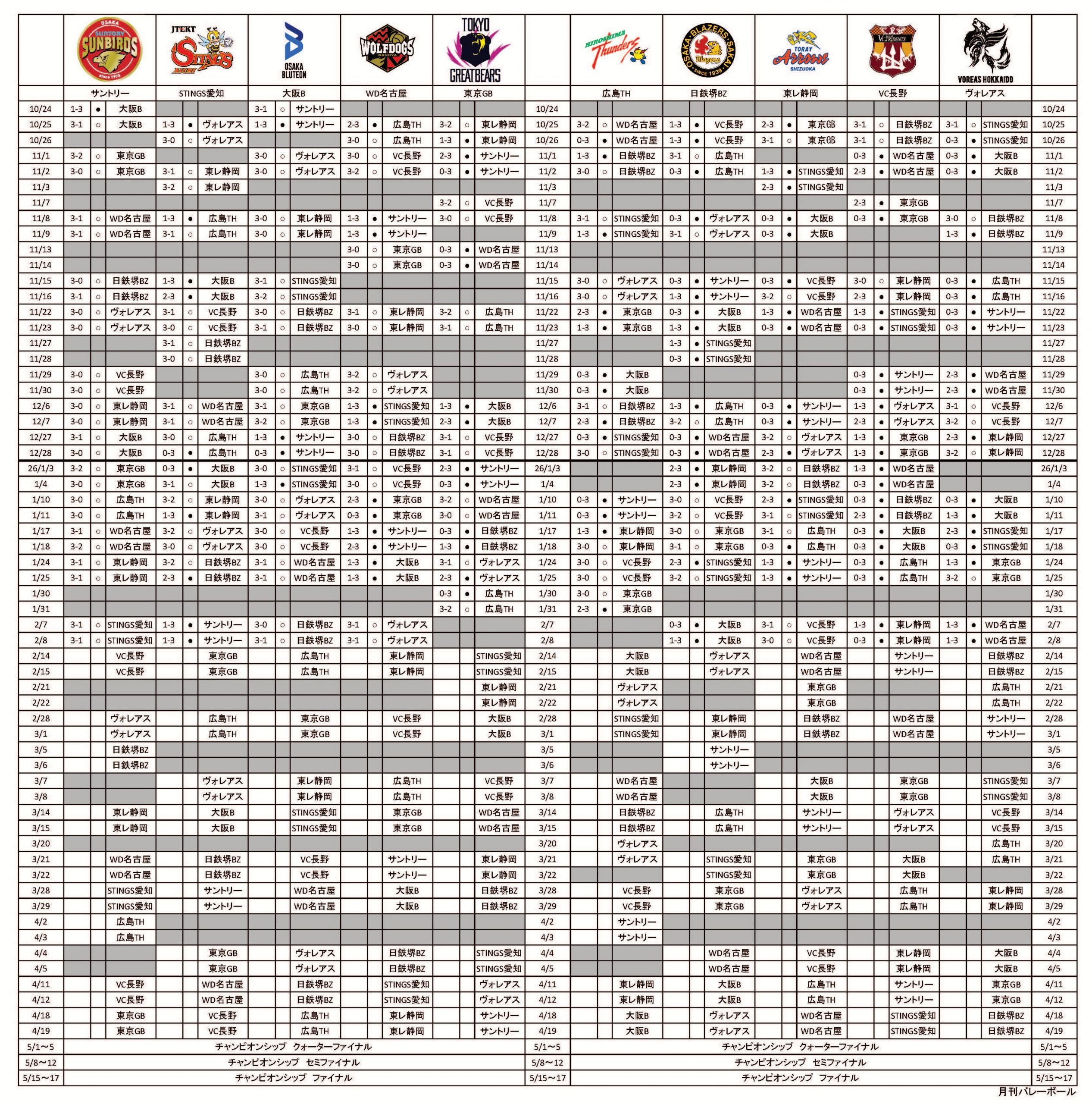 首位のサントリーサンバーズ大阪を追いかける2位の大阪ブルテオンは、アウェーで日本製鉄堺ブレイザーズと対戦。初戦は西田有志(16得点)を中心に得点を重ねてストレート勝ちを収めた。続く2戦目では1セットを落としたものの、西田(19得点)、富田将馬(15得点)、ミゲル・ロペスとエバデダン ラリー(いずれも14得点)、西川馨太郎(10得点)の5選手が2桁得点をあげる多彩な攻撃を展開して3-1で勝利し、連勝を8に伸ばした。