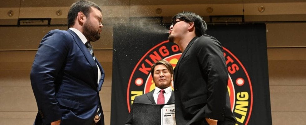 新日本プロレスは10日、大阪・OIT梅田タワー 常翔ホールで11日に阪府立体育会館(エディオンアリーナ大阪)で開催する「THE NEW BEGINNING in OSAKA」で行うNEVER無差別級選手権試合の公開調印式を実施した。