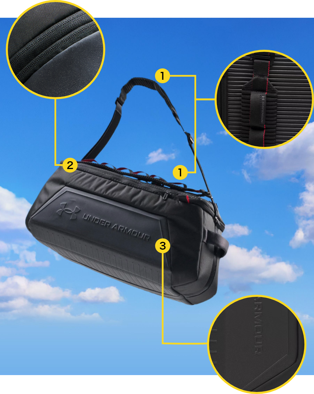 さらに「UAストームテクノロジー」とコーディングジッパーを搭載しており、大雨の中でも荷物を保護する防水性能を備えている。遠征や合宿など大量の荷物を持ち運ぶシーンを想定した設計となっている。
