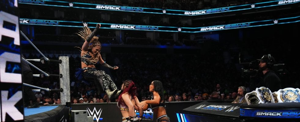 WWE「SmackDown」で行われたWWE女子タッグ王座戦は、人気の王者チーム”RHIYO”ことイヨ・スカイ&リア・リプリーに、ジュリア&キアナ・ジェームズの気鋭コンビが挑戦。息の合った連携が光った一戦となった。特に序盤、場外の三段攻撃でイヨ・スカイを大開脚ダウンに追い込んだシーンは、試合全体の流れを象徴する場面となった。