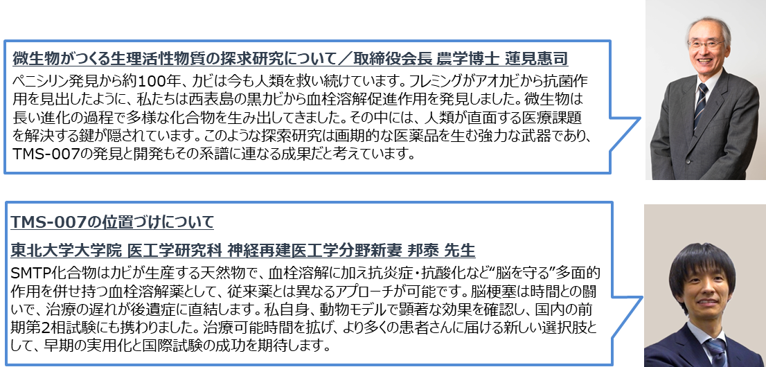 現在、注目を集めているのが、沖縄県・西表島の黒カビから見出された脳梗塞治療薬候補「TMS-007」です。血栓を溶かす作用に加え、炎症を抑える作用を併せ持つ点が特徴です。