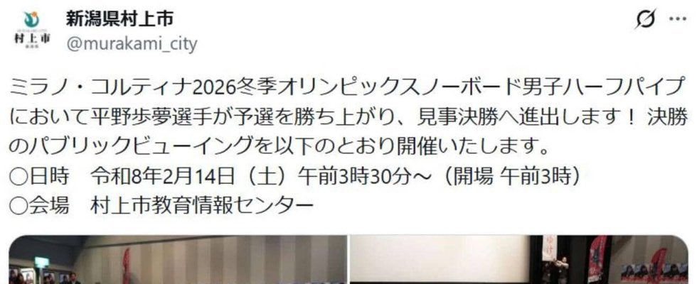 先月17日にスイスで行われたW杯の決勝で激しく転倒し、複数箇所の骨折や打撲の診断を受けた平野歩夢(27=TOKIOインカラミ)も決勝進出。これを受けて故郷、新潟・村上市は公式Xを更新し「ミラノ・コルティナ2026冬季オリンピックスノーボード男子ハーフパイプにおいて平野歩夢選手が予選を勝ち上がり、見事決勝へ進出します! 決勝のパブリックビューイングを以下のとおり開催いたします。◯日時 令和8年2月14日(土)午前3時30分~(開場午前3時)◯会場 村上市教育情報センター」と、パブリックビューイングの開催を発表した。