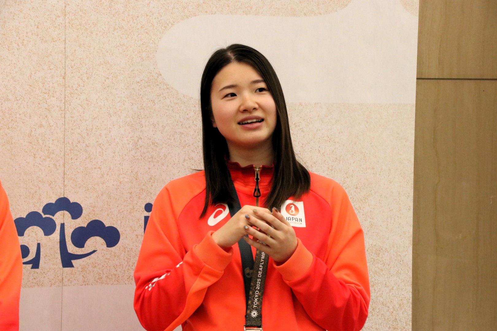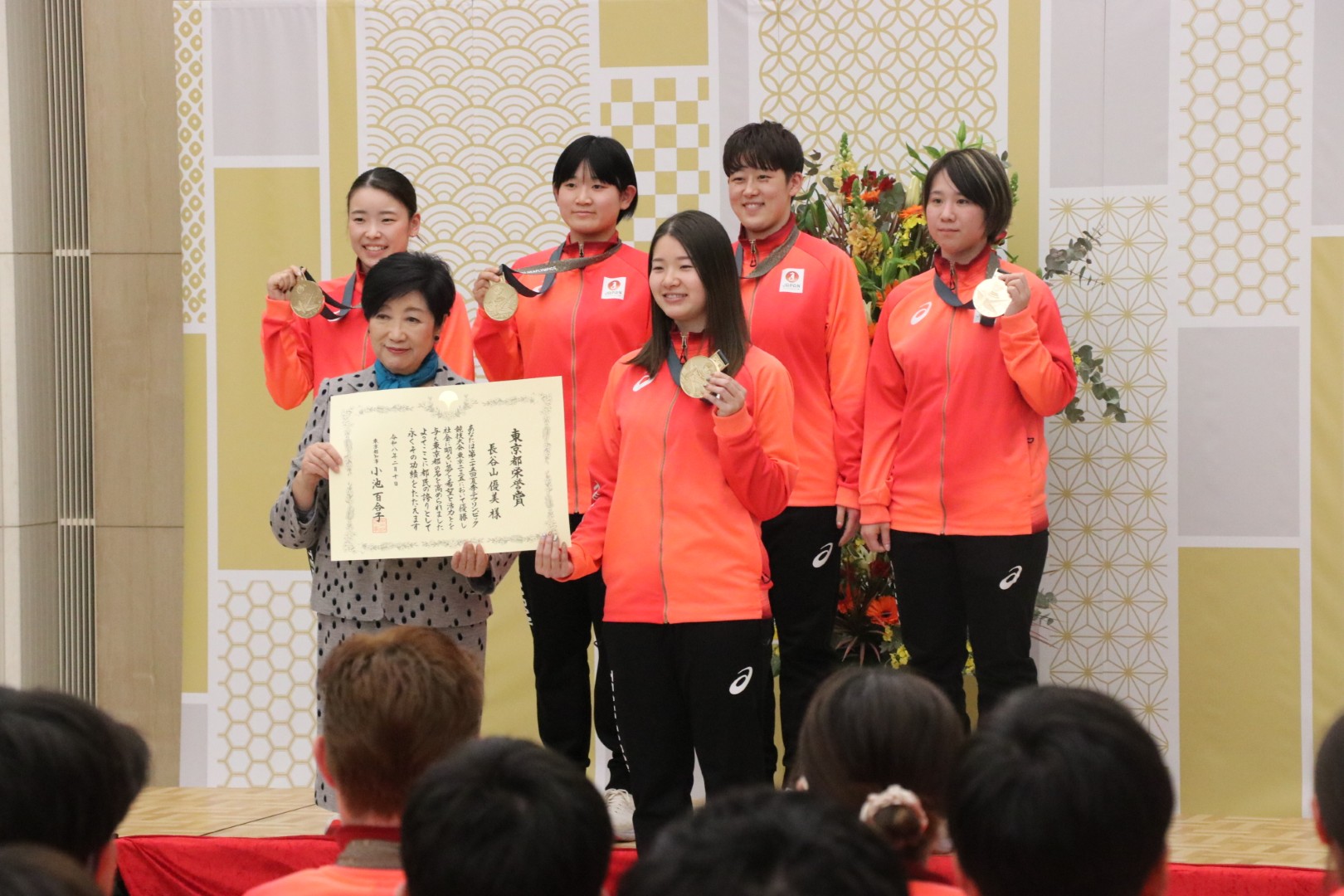 表彰式にはデフリンピックのほか、昨年開催された世界陸上のメダリストと合わせて50人以上が出席。競技ごとに小池百合子都知事から表彰状を受け取り、最後は全員で記念写真に納まった。デフバレーボール女子日本代表で対象となった佐藤愛莉、髙濵彩佑生、中田美緒、長谷山優美、松永彩珠の5人も登壇し、金メダルとともに笑顔を輝かせた。