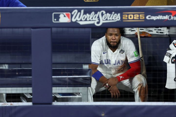 ワールドシリーズ終了後に涙をこらえながら、ベンチに座るゲレーロJr.。このあとクラブハウス内で彼の涙腺は崩壊した(C)Getty Images