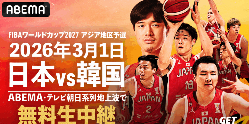 動画配信プラットフォームの「ABEMA(アベマ)」は『FIBA バスケットボールワールドカップ2027』アジア地区予選において、3月1日に沖縄で開催される日本対韓国の試合を無料生中継する。配信は13時30分に開始予定であり、実況・解説を務める出演者などの詳細は決定次第、順次告知される。