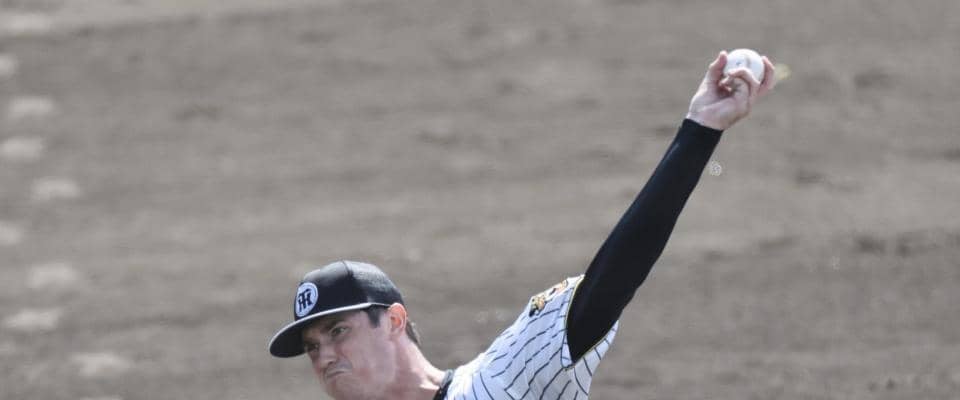 「阪神春季キャンプ」(13日、宜野座) 阪神の新外国人、イーストン・ルーカス(29)=前ブルージェイズ=が初めてライブ…