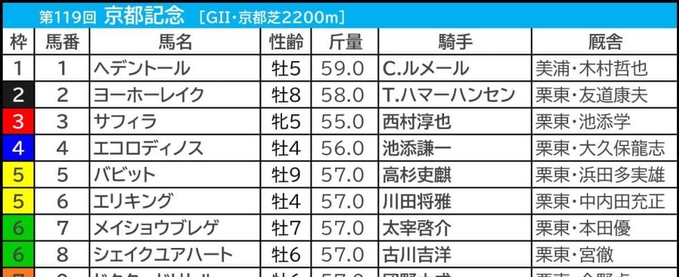 JRAは13日、第119回京都記念(GII、京都芝2200m)の枠順を発表した。