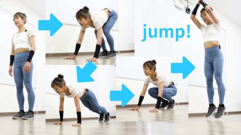 バーピーとは、立つ、しゃがむ、腕立て姿勢になる動作を連続で行う種目です。全身の筋肉を使うため単体種目としては消費カロリーが非常に高く、心拍数も急上昇します。