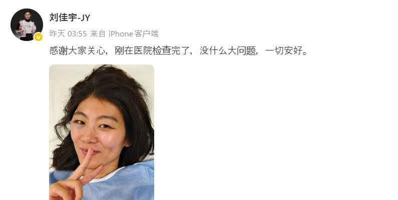 劉は患者衣姿でピースする自撮り写真を投稿。「皆さんからのお気遣いに感謝します。たった今、病院での検査が終わりました。大きな大きな問題はなく、全て順調です」と元気な姿を見せた。