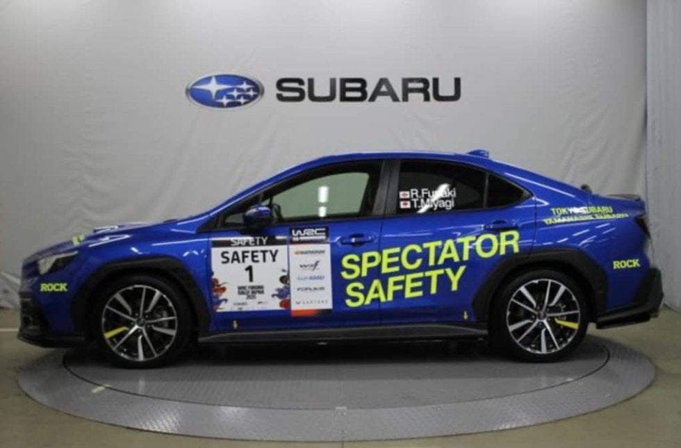 この車両は山梨スバル自動車(株)スバルカースポット甲府が販売しており、ラリージャパン2025で競技車両が走行する前にSSなどのコースを走行した車両で、観客の安全を確認するために走行。WRブルー・パールに黄色で「SPECTATOR SAFETY」と記載されている。この車両をラリージャパンでドライブしたのは船木良氏。WRCラリーオーストラリアにも参戦経験のあるラリードライバーだ。