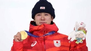 涙ながらに金メダルを掲げた戸塚(C)Getty Imags 現地時間2月13日、ミラノ・コルティナ五輪のスノーボード男子…